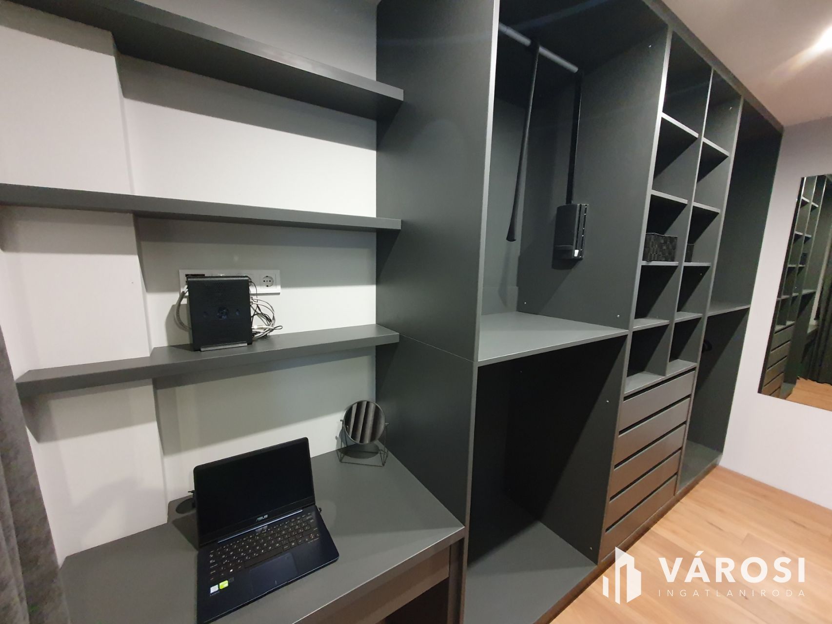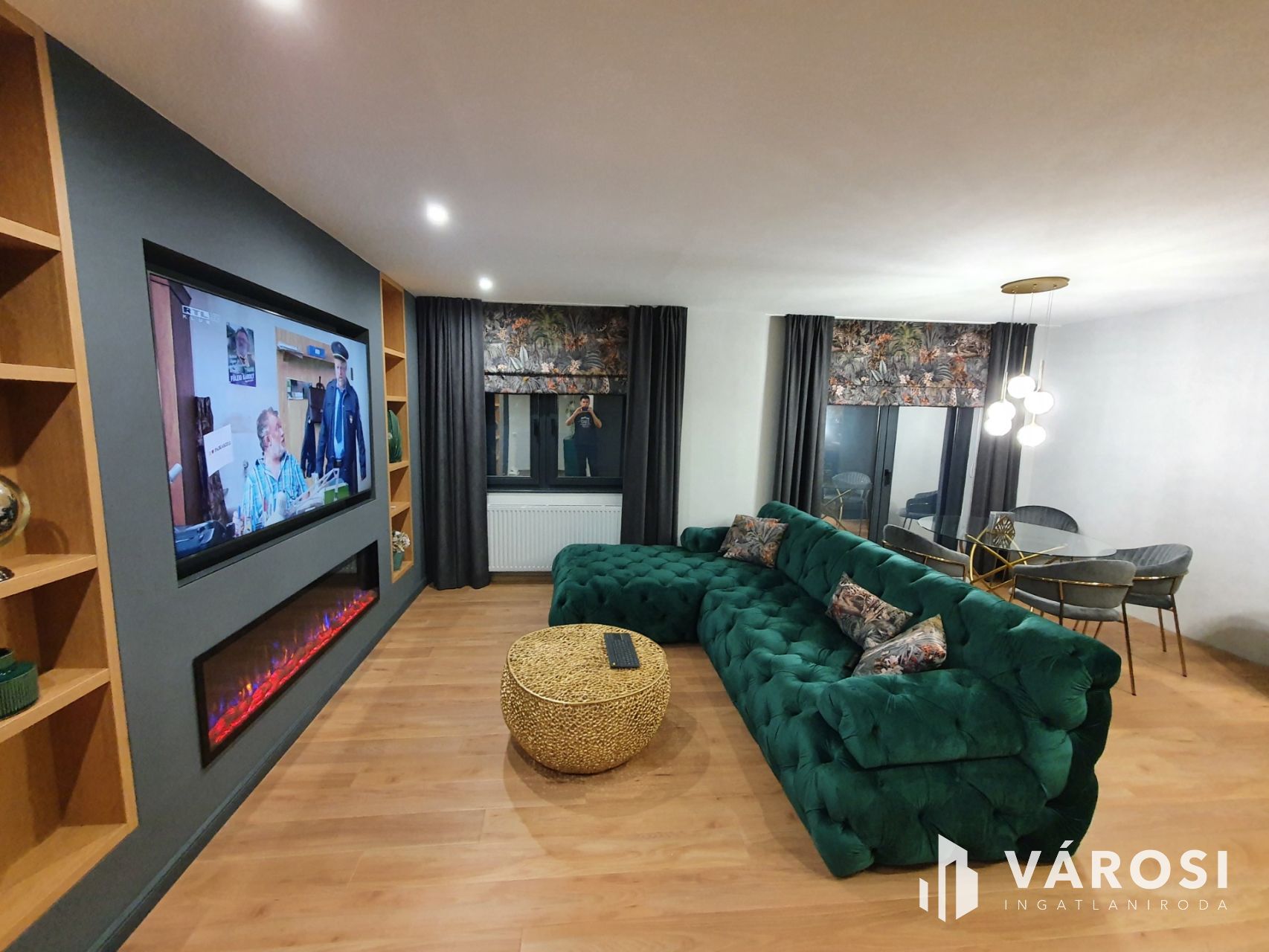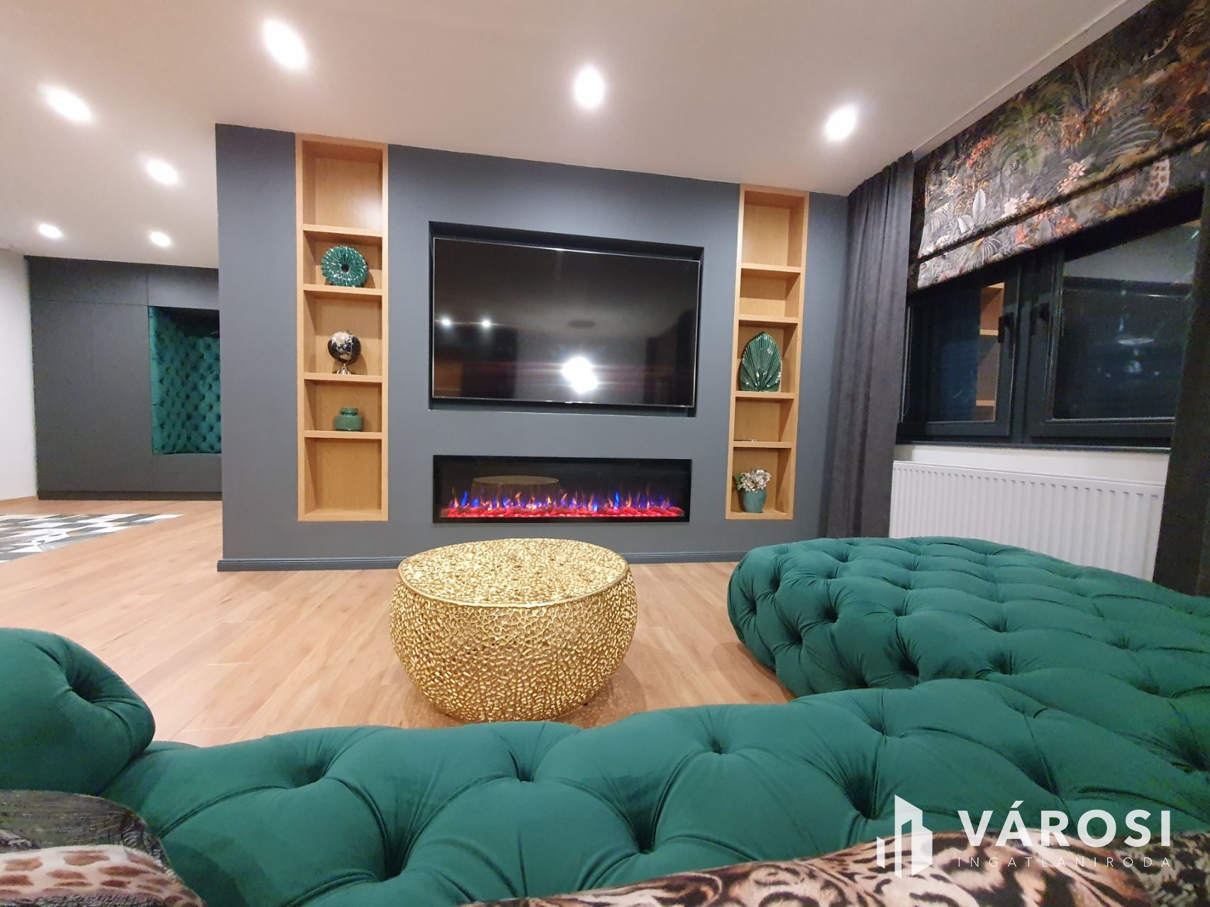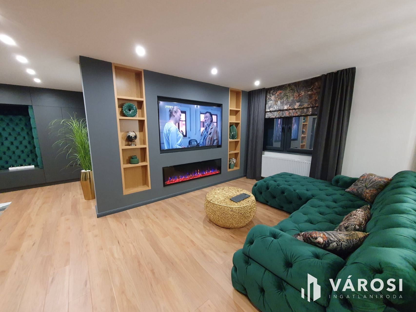 A tágas amerikai konyhás nappali része az exclusive design étkező asztal, a két db LED 4K lapos tv, a modern ülőgarnitúra dísz párnákkal kiegészítve, a beépített szekrények, az előszoba bútor, ágynemű tartós francia ágy, az exclusive római rolós függönyök, valamint a lebegő képtartó polcok. A nyílászárok antracit színűek, elektromos távirányítós alu redőnyökkel valamint szúnyoghálóval felszereltek. Az ablakokra hővédő tükrös fólia került felhelyezésre.