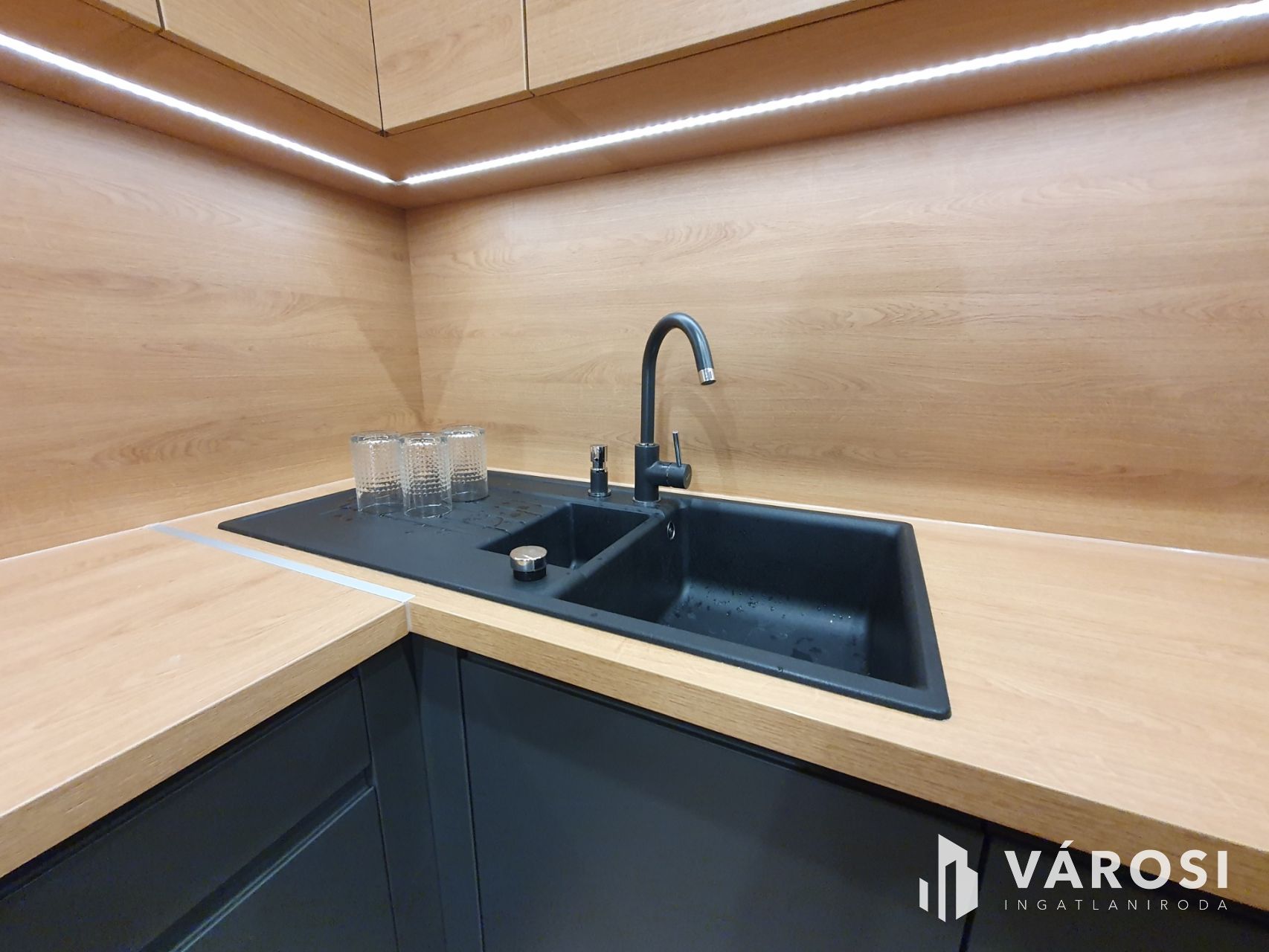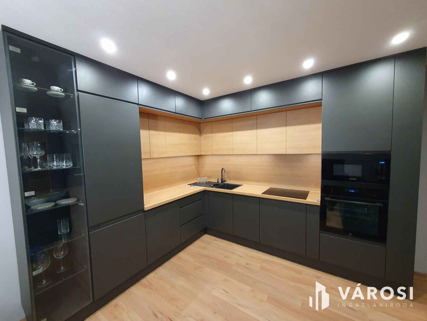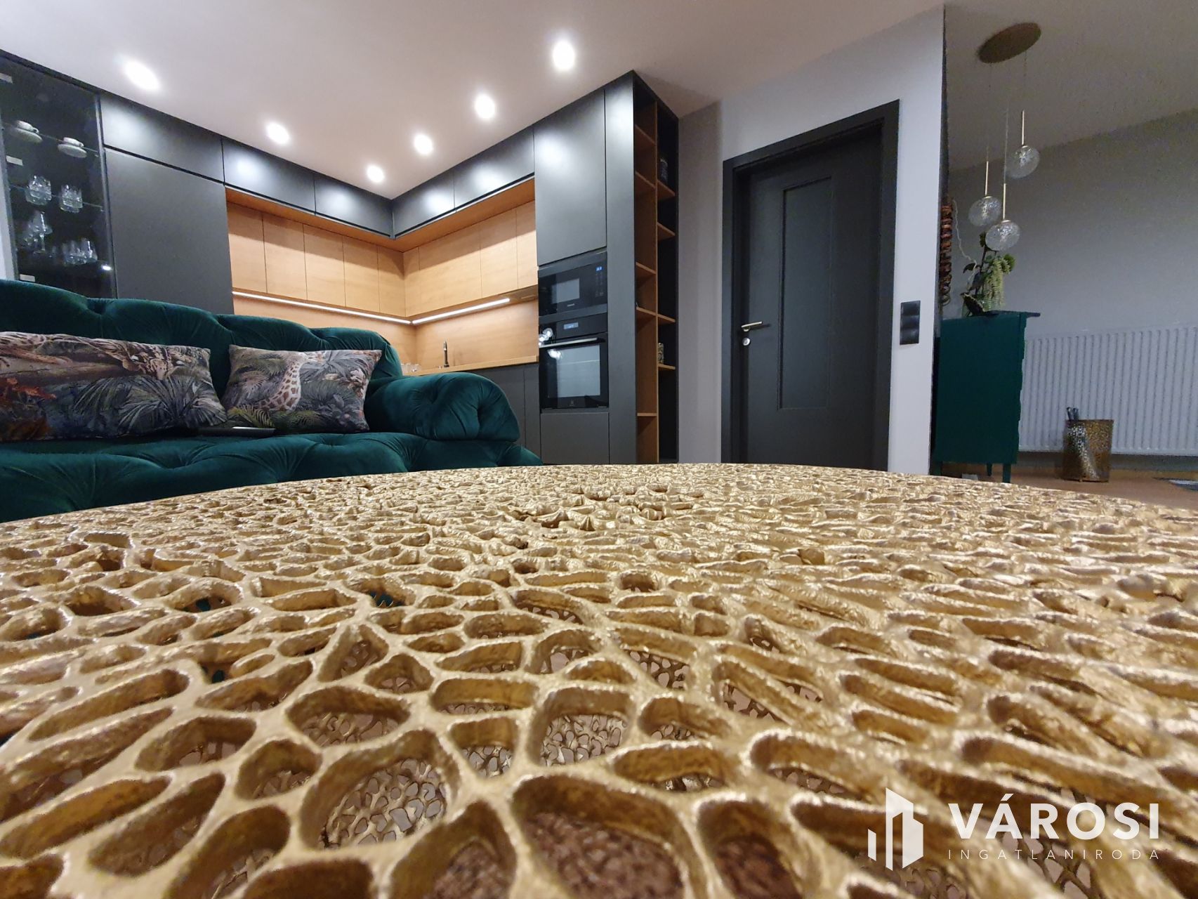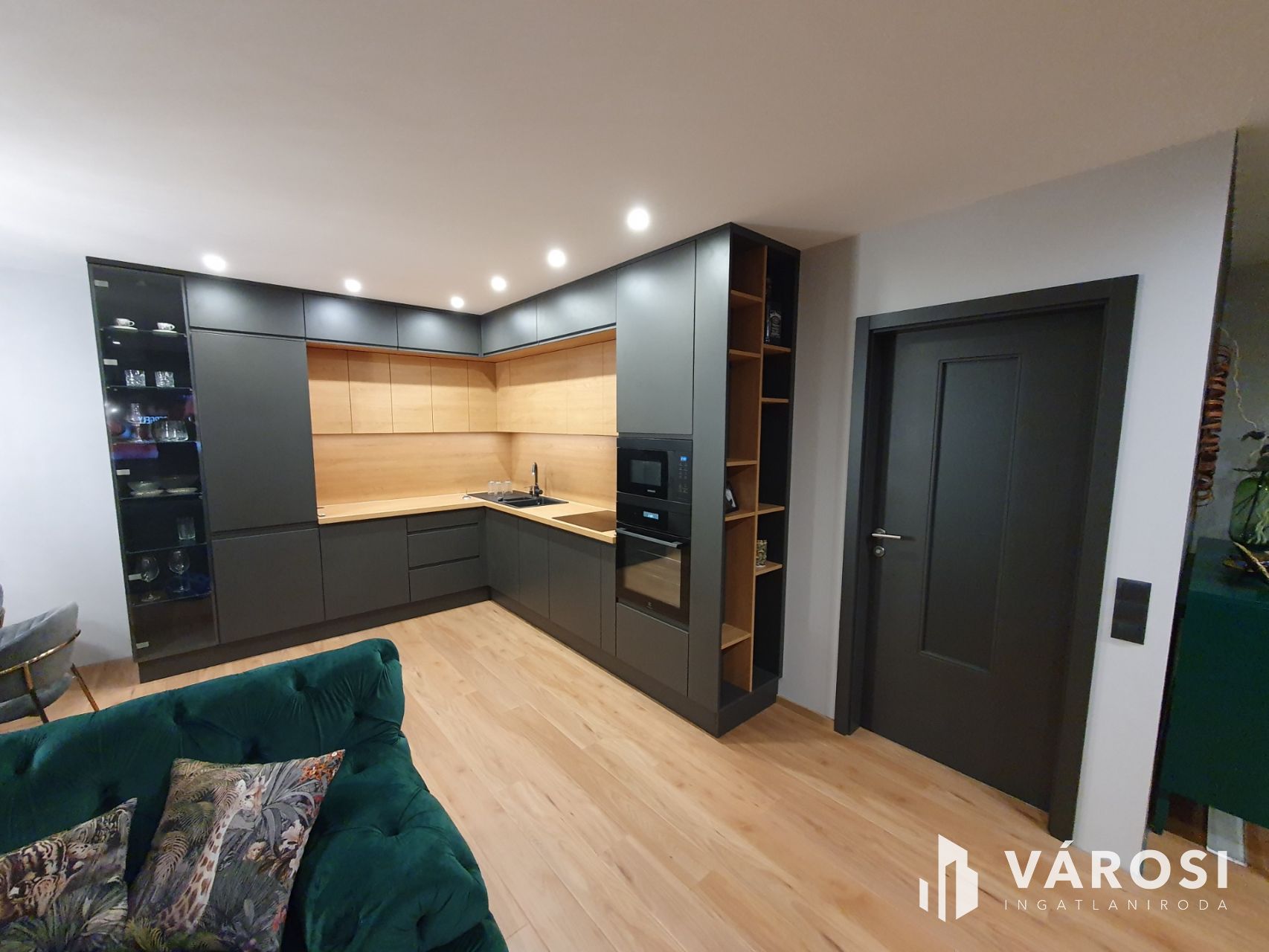 A folyosón és a szobákban magas kopásálló laminált padló és spanyol design járólap található. Beltéri ajtók fényezett egyedi MDF ajtók. A konyhai részen egyedileg gyártott modern, fényezett antracit konyhabútor, nyomógombos beépített szekrények teljesítenek szolgálatot. A konyha felszereltsége: A++ Hűtőszekrény, fagyasztó, sütő, főzőlap, pára elszívó, mosó-szárító gép, mosogató gép. Blanco gránit mosogató tálca, csaptelep, mosószer adagoló.