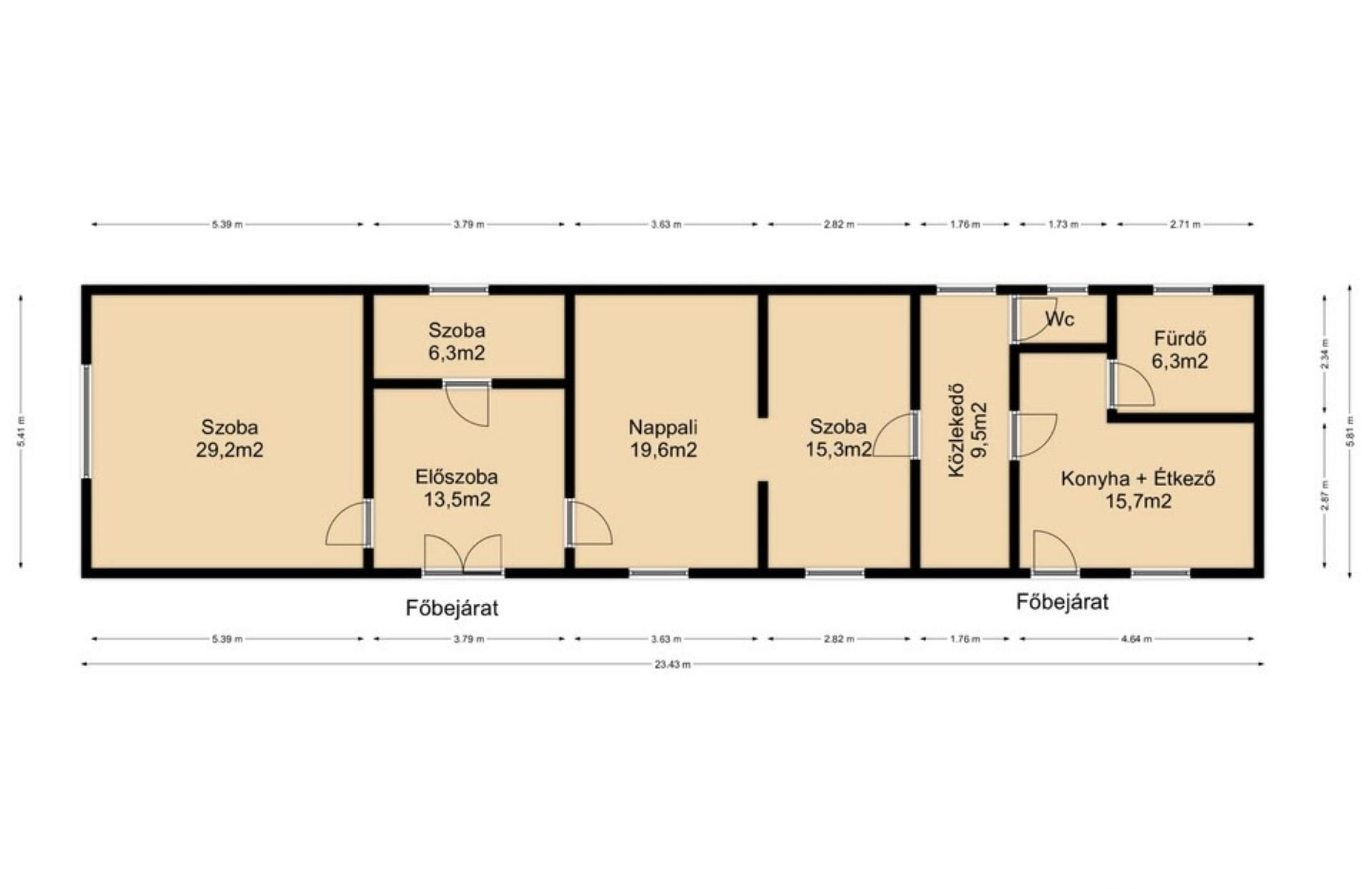 Belső lakrész helységei: nappali, 3 szoba, előszoba, közlekedő, külön fürdő, külön mellékhelység, konyha étkező.