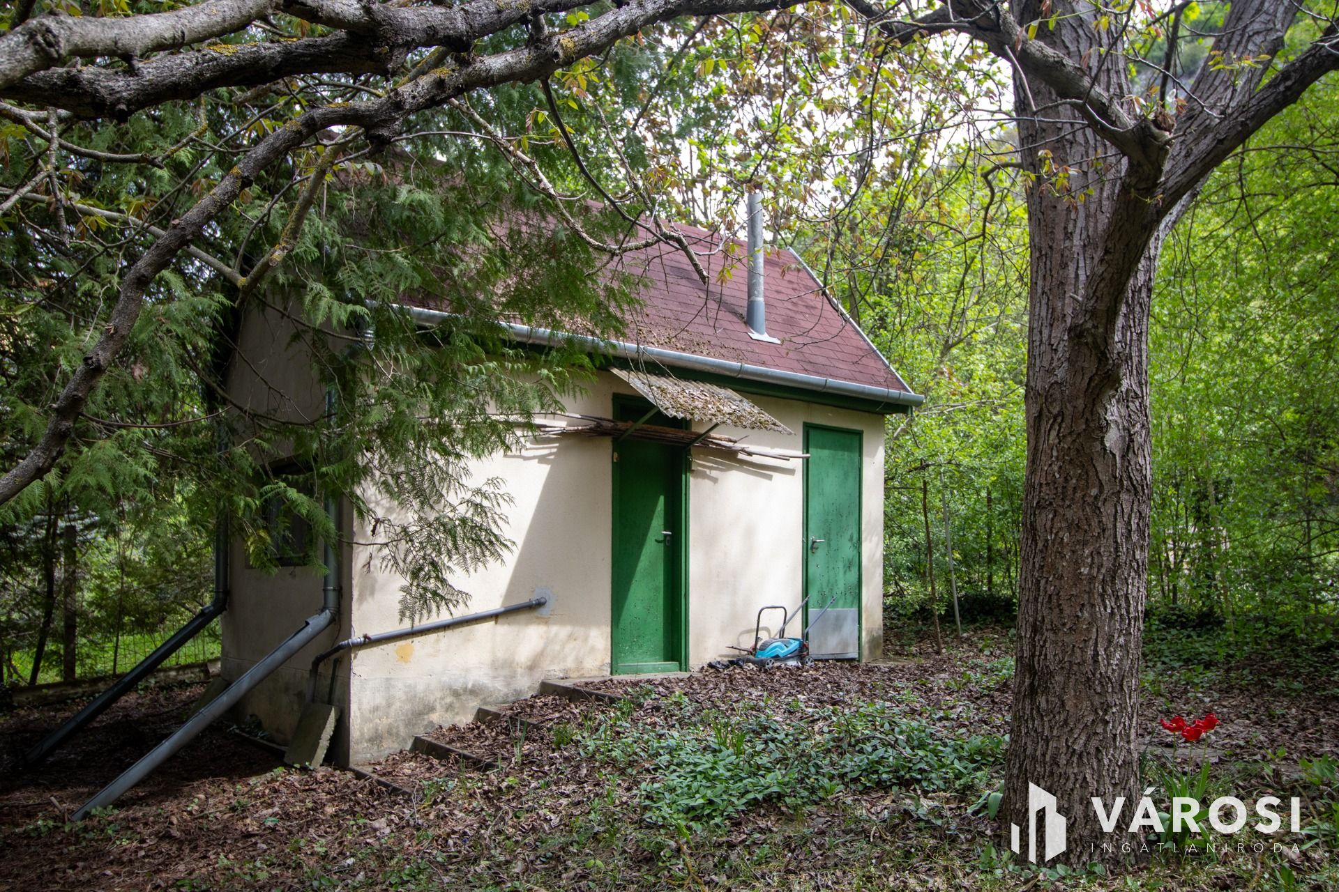 The garden, dotted with flowers, hazelnut, walnut, and pine trees, features a late-70s "ÉVA" type wooden cabin. It is built on a stone-clad concrete foundation and is in remarkably good (well-maintained) condition, featuring a living room, bedroom, kitchen, bathroom, and terrace. Additionally, in the corner of the plot, there is a brick-built summer kitchen, also in good condition, with useful storage spaces and an attic.