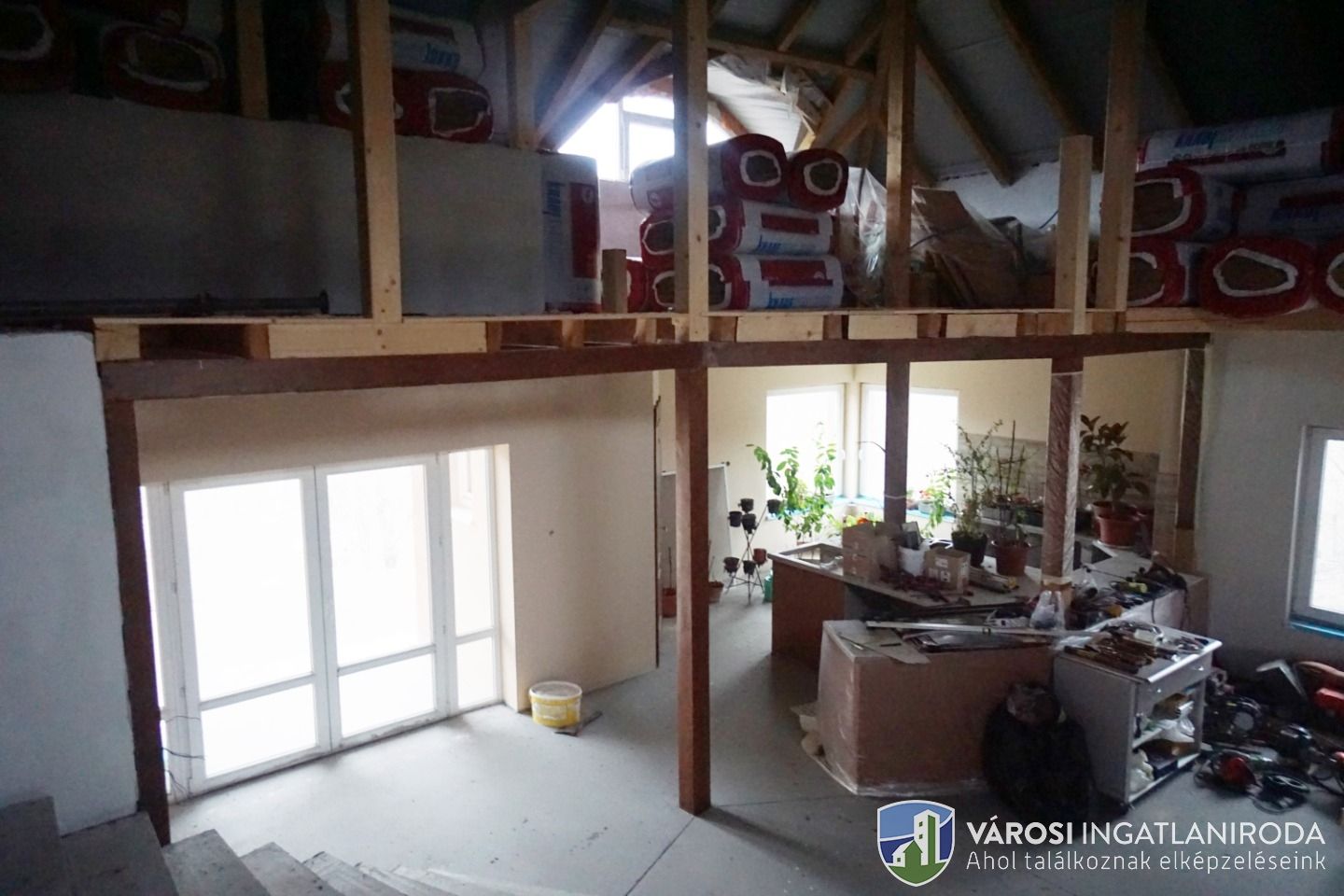 A területből 9278 nm részben lekerített építési terület, rajta 65 %-os készültségű 342 nm-es családi házzal.