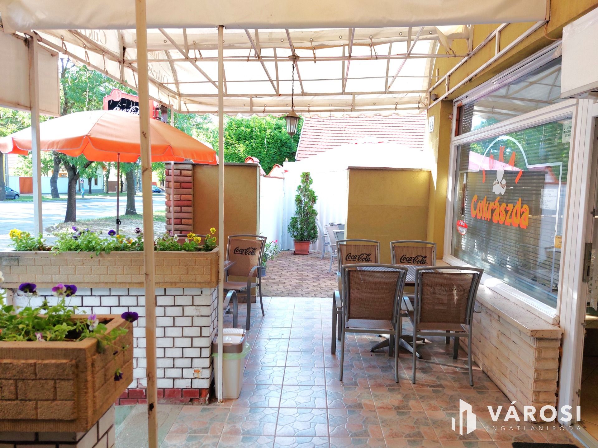 Funkcionálisan három részre osztható, lakás, cukrászda, cukrászüzem. Legnagyobb értéke kivételes elhelyezkedésésében és könnyű megközelíthetőségében rejlik. Saját használatú, ingyenes vendég parkoló tartozik hozzá. Az ismert ingatlan telek mérete 640m2, ahol a főépület mögött 40m2 alapterületű cukrászüzem működik. A térkővel burkolt udvarban áll egy zárt mobil garázs elektromos kapuval, 4 fedett kocsibeálló és mindez egy óriás vadgesztenyefa, tuják és virágok társaságában.