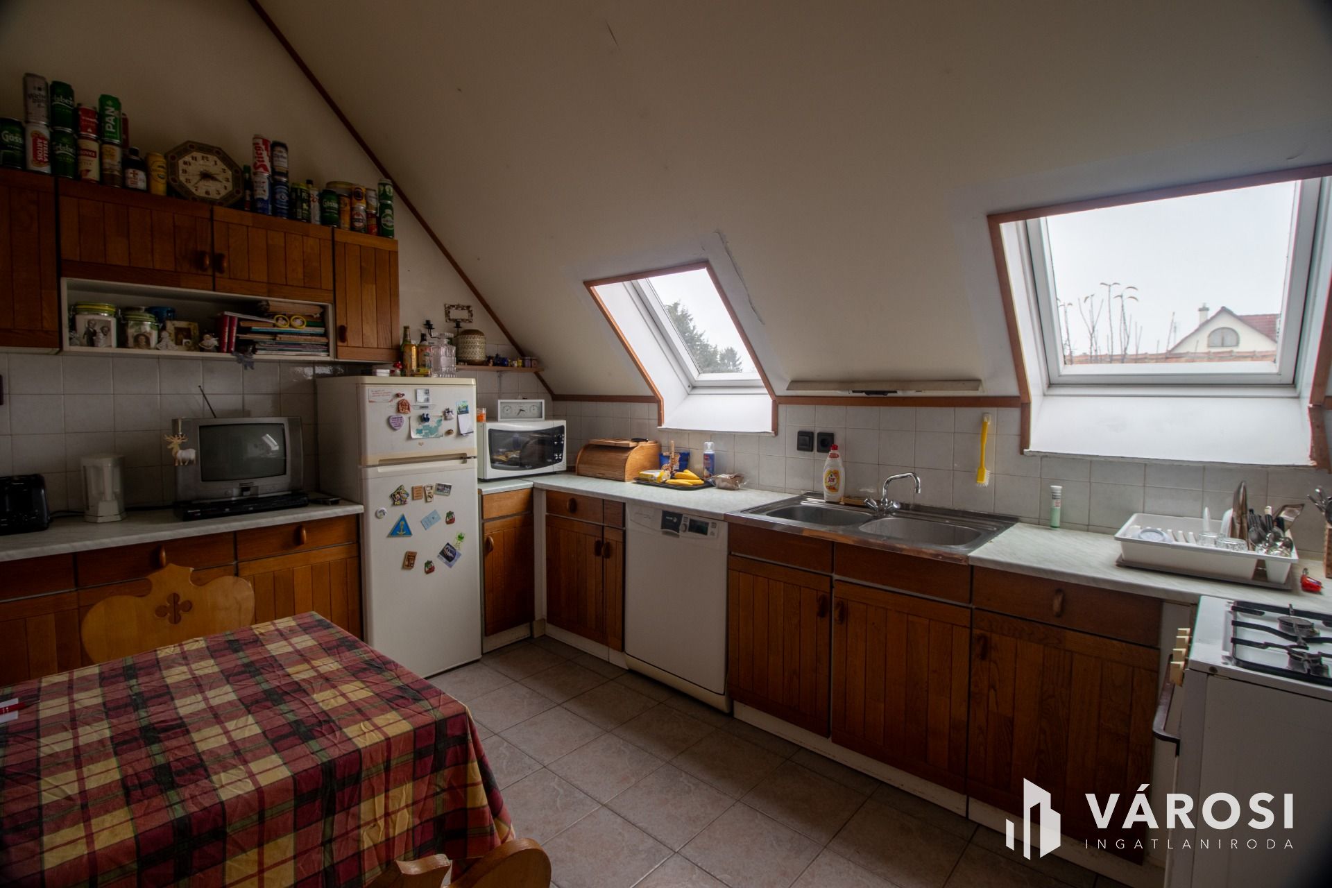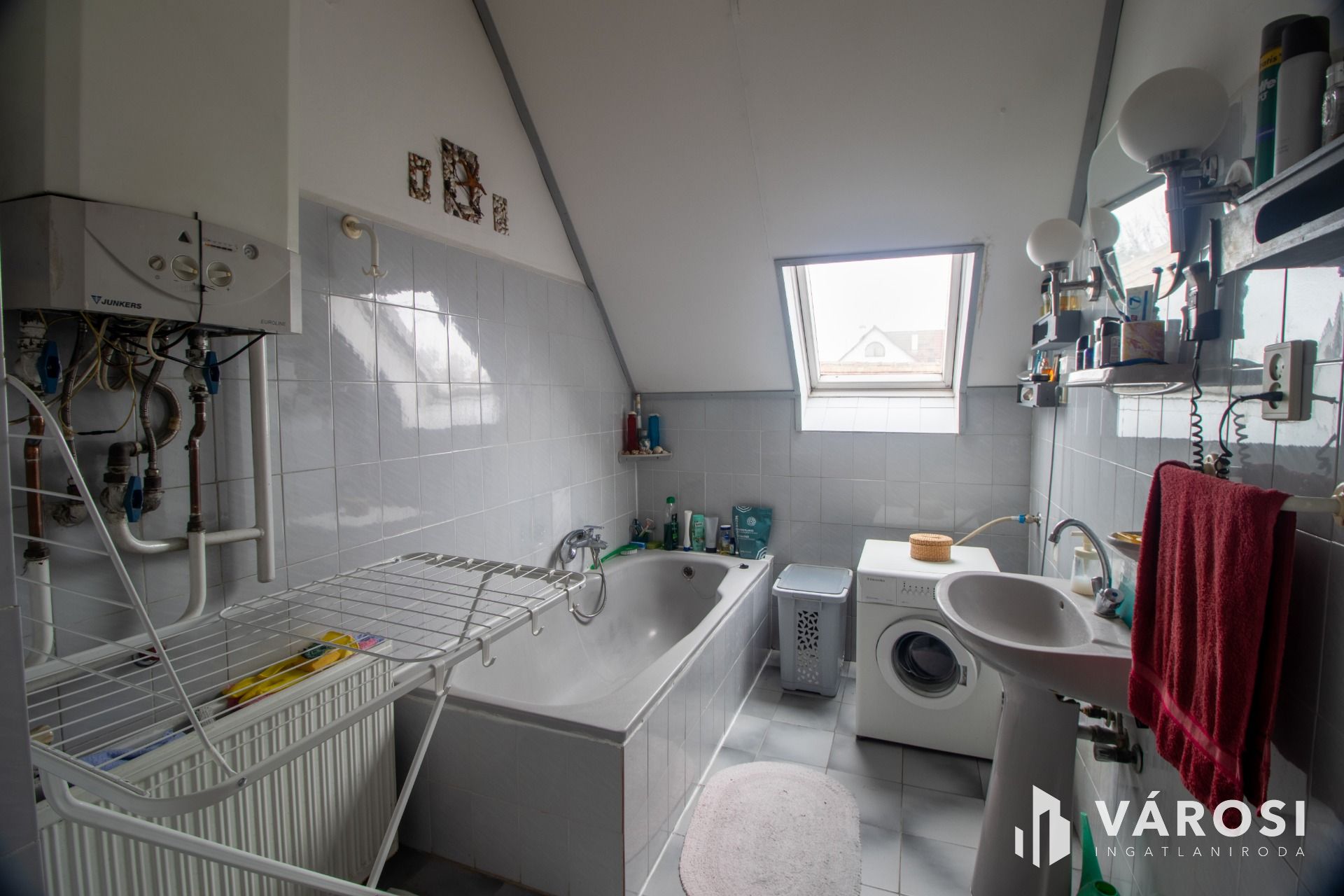 A felső szinten egy jó állapotú 90 nm-es lakás található, fűtését központi gázkazán biztosítja.