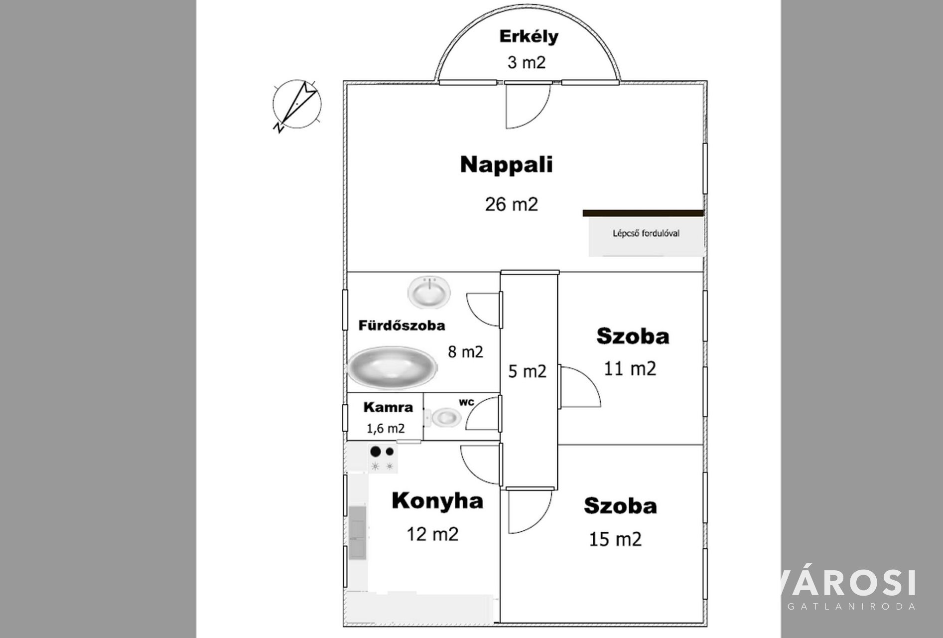 A közlekedőből jobbra nyílik a 8nm-es fürdőszoba, külön WC, a konyha (12 nm) egy praktikus kamrával, balra pedig a dél-nyugati tájolású 11 nm-es és 15 nm-es szoba.