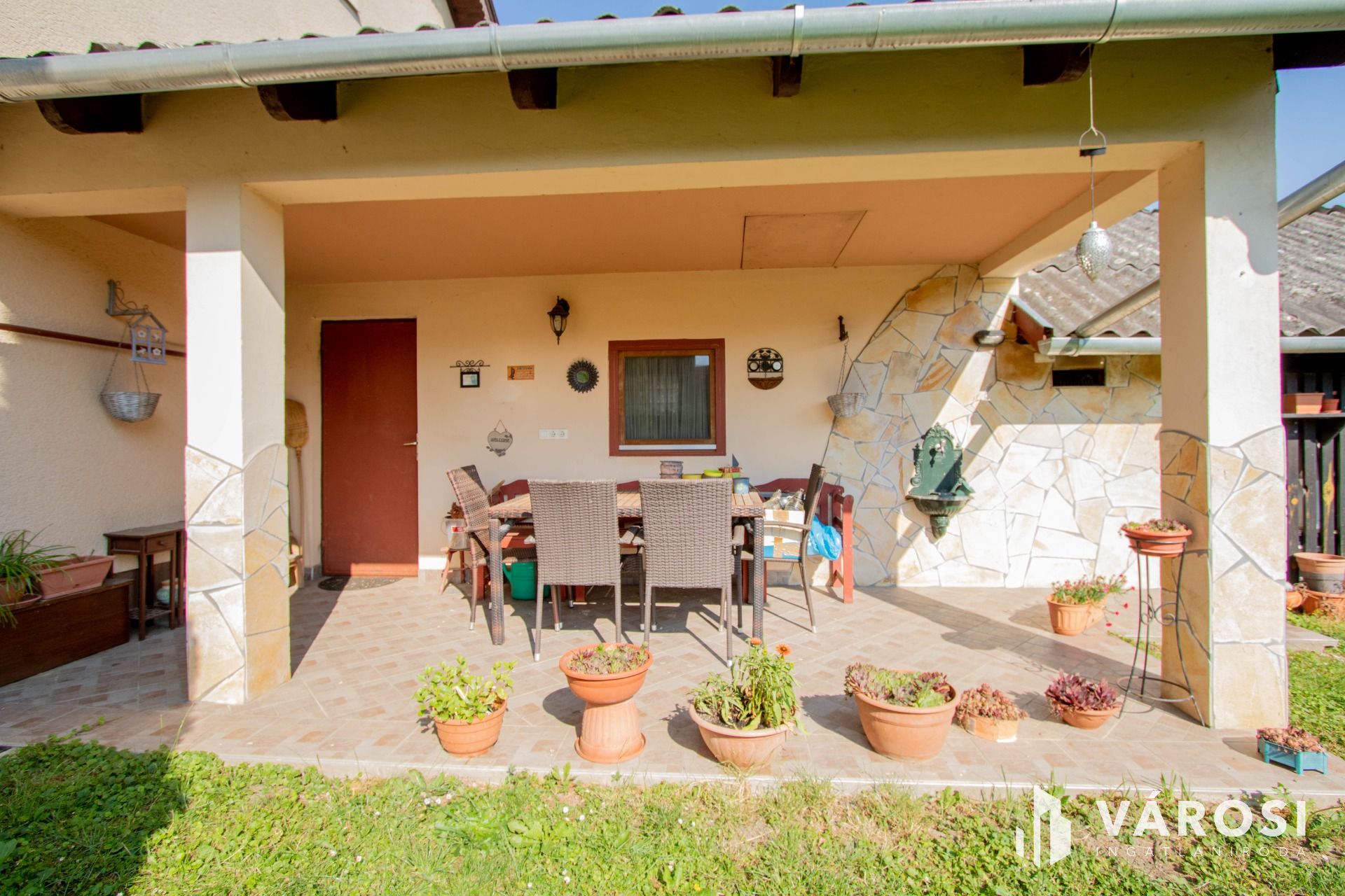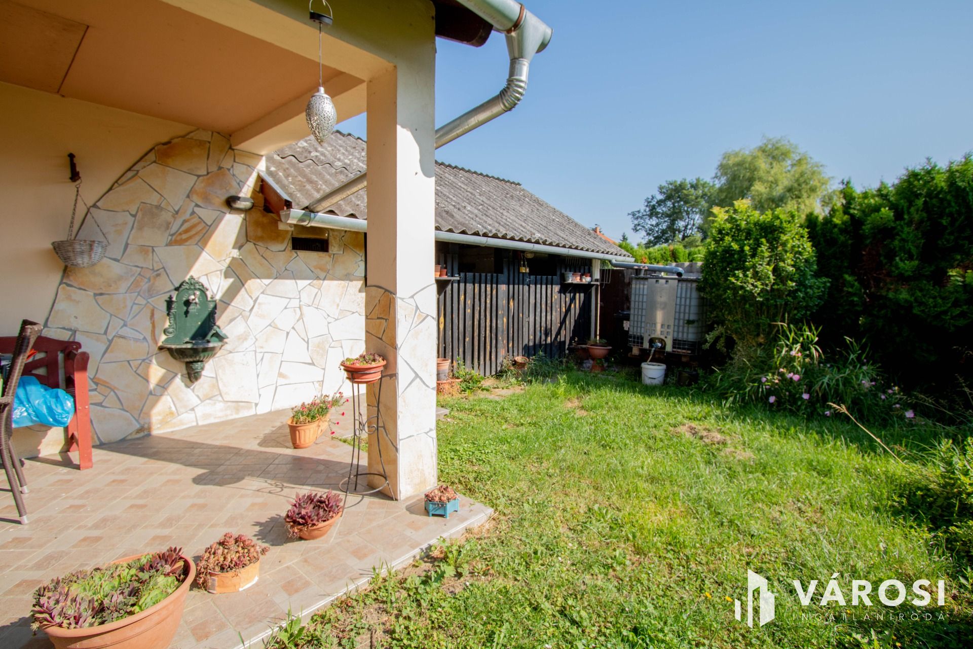 A házhoz tartozik egy 20 nm nagy garázs is, a kazánház (11 nm) a pince szinten van, innen nyílik egy ajtó a nyári konyhára (21 nm), akár műhely vagy bármi más is kialakítható belőle.