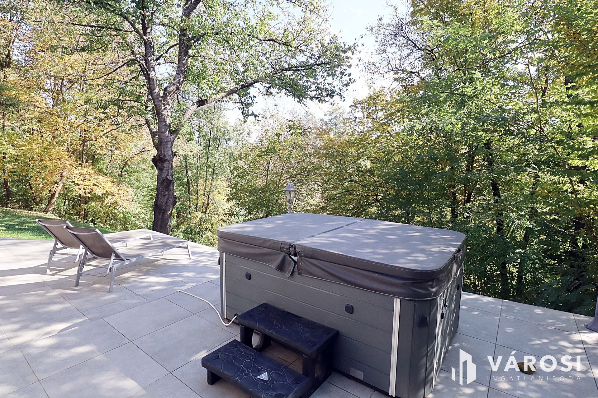 Az épületen belül is harmonizál a sok természetes anyag, de ha esetleg még közelebb szeretnénk érezni a természetet, akkor a hatalmas teraszon lévő fűthető jakuzziból is megtehetjük ezt éjjel-nappal.