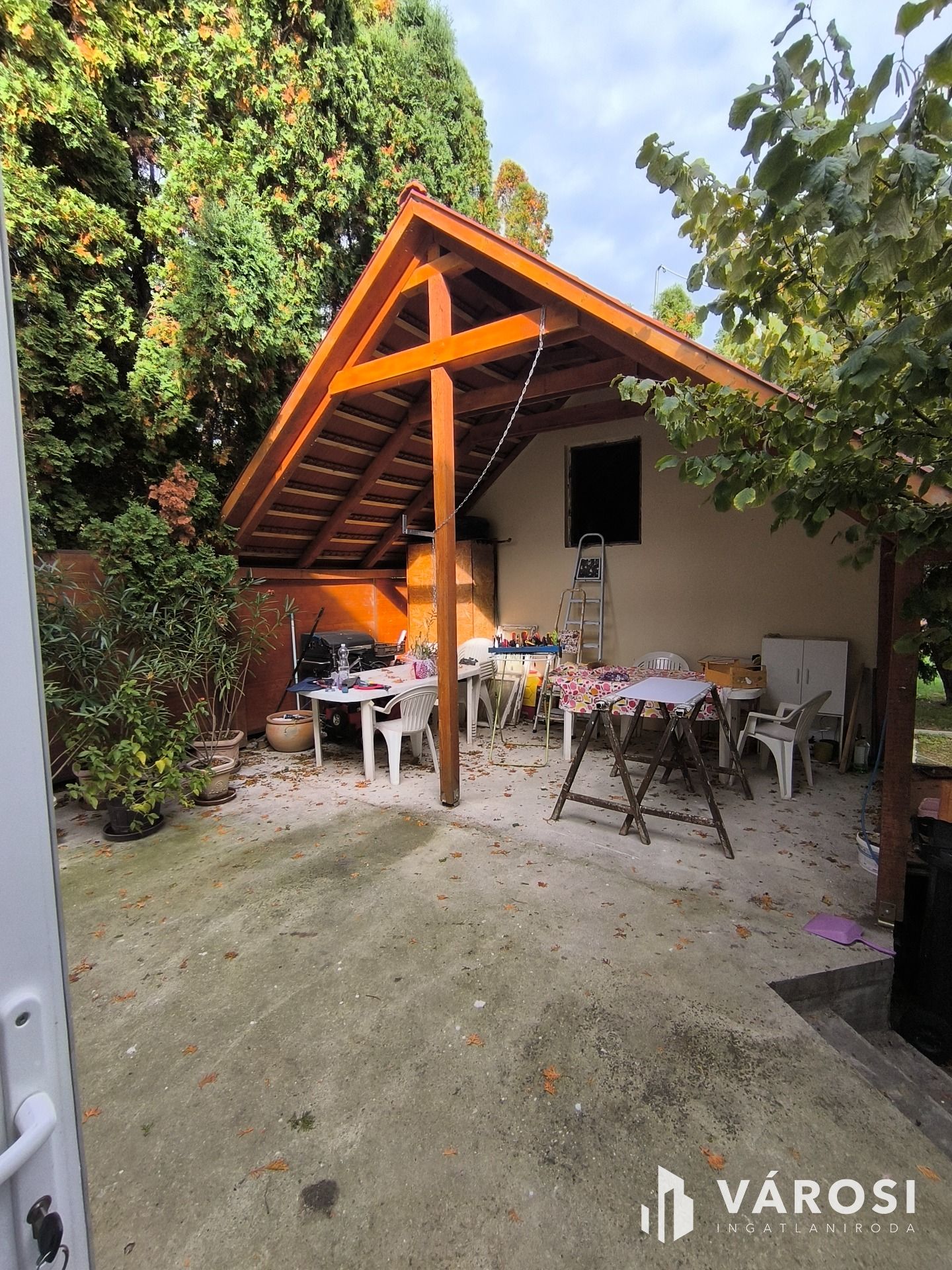 Parkosított, romantikus kert veszi körül a házat. A ház mögött félig fedett terasz, garázs és hátul egy 3 autó számára alkalmas fedett beálló is van.