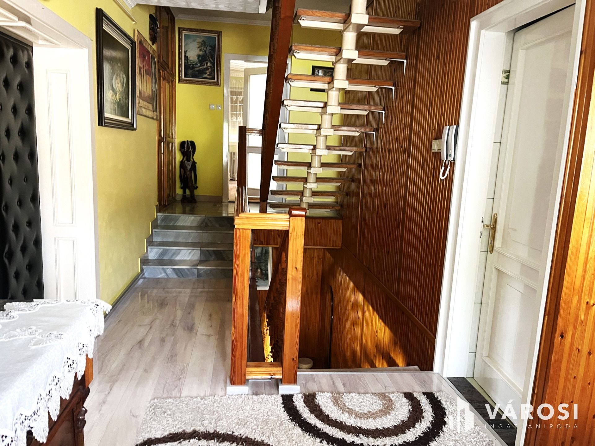Az emeleti lakótérben az amerikai konyhába és étkezőbe érkezünk, ahol a modern, egyedi konyhabútor új elektromos berendezéseket rejt magába, az értékes antik bútorok mellett. Ezen a szinten található három világos, tágas szoba, eredeti, szép állapotú, parkettázott aljzattal. A udvar felőli szobában hangulatos, fa tüzelésű kandallót építettek be. Majd az új burkolatú közlekedőn keresztül eljutunk az igényesen felújított sarokkádas, zuhanyzós fürdőszobába és külön toalettbe.