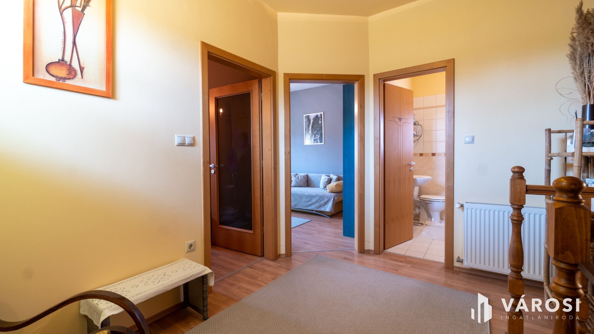 Emelet: Az elegáns falépcsőn elérhető szinten további két hálószoba található, melyek közül az egyik saját terasszal rendelkezik. A szintet egy igényes, káddal felszerelt fürdőszoba teszi teljessé.