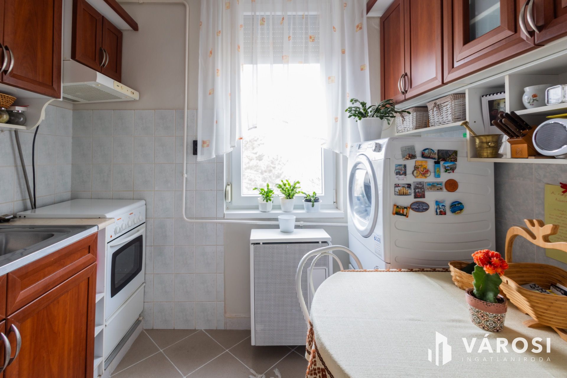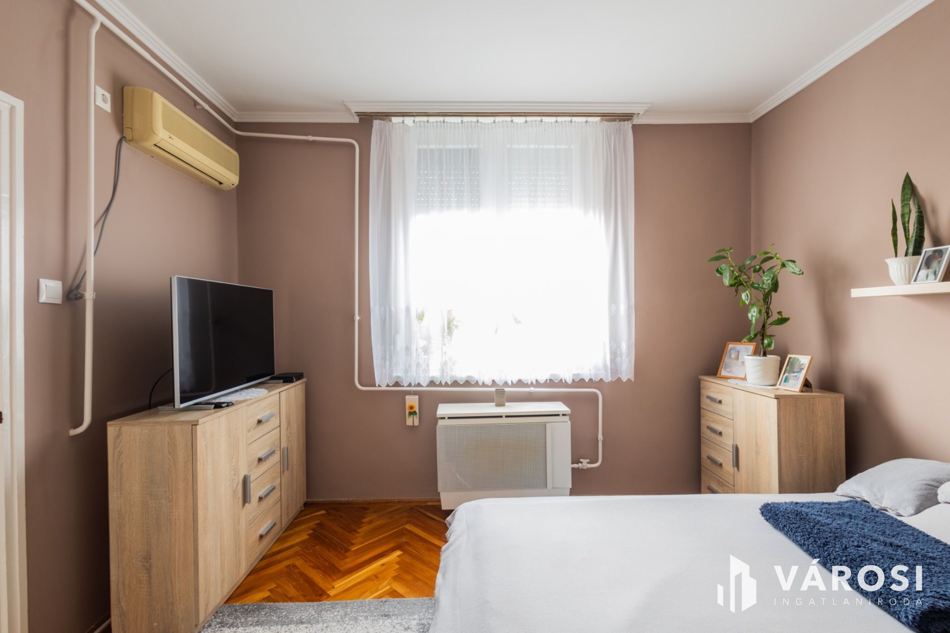 A lakás elrendezése praktikus és otthonos: egy tágas szobával, nagy nappalival, napsütötte erkéllyel, kényelmes konyhával, valamint külön fürdőszobával és WC-vel rendelkezik, emellett egy kamra és több gardróbszerkény is segíti a pakolást. Az ingatlan új műanyag nyílászárókkal és redőnyökkel van felszerelve, így biztosítva a hő- és hangszigetelést. A szúnyoghálók további kényelmet nyújtanak a nyári hónapokban.