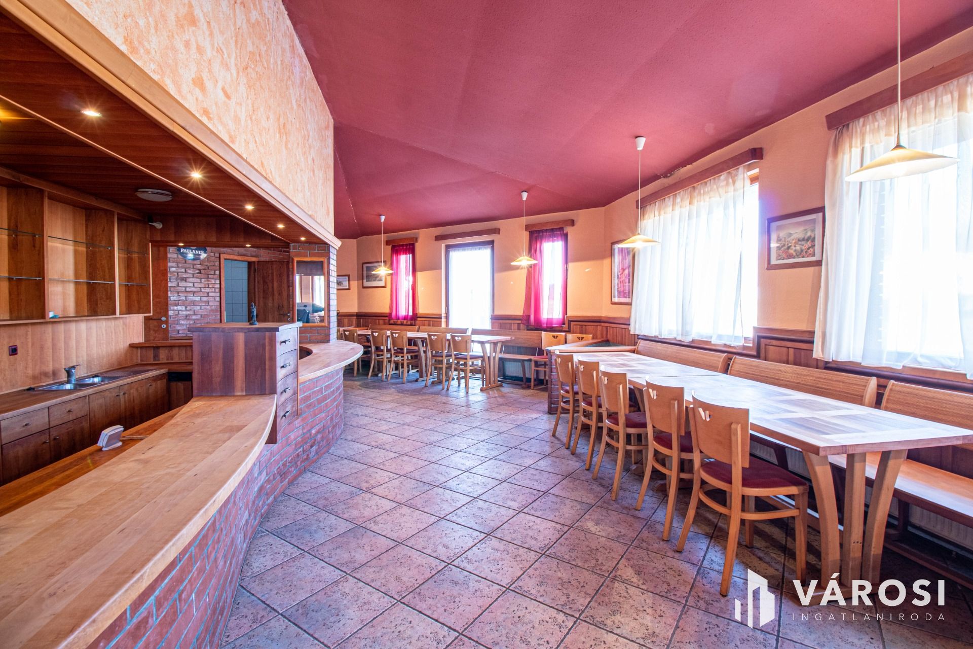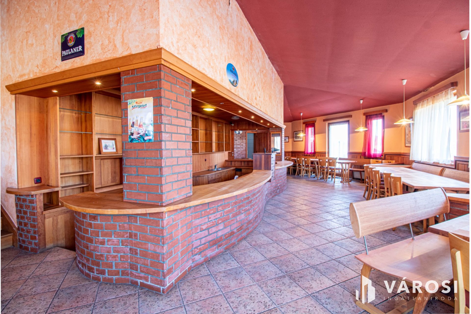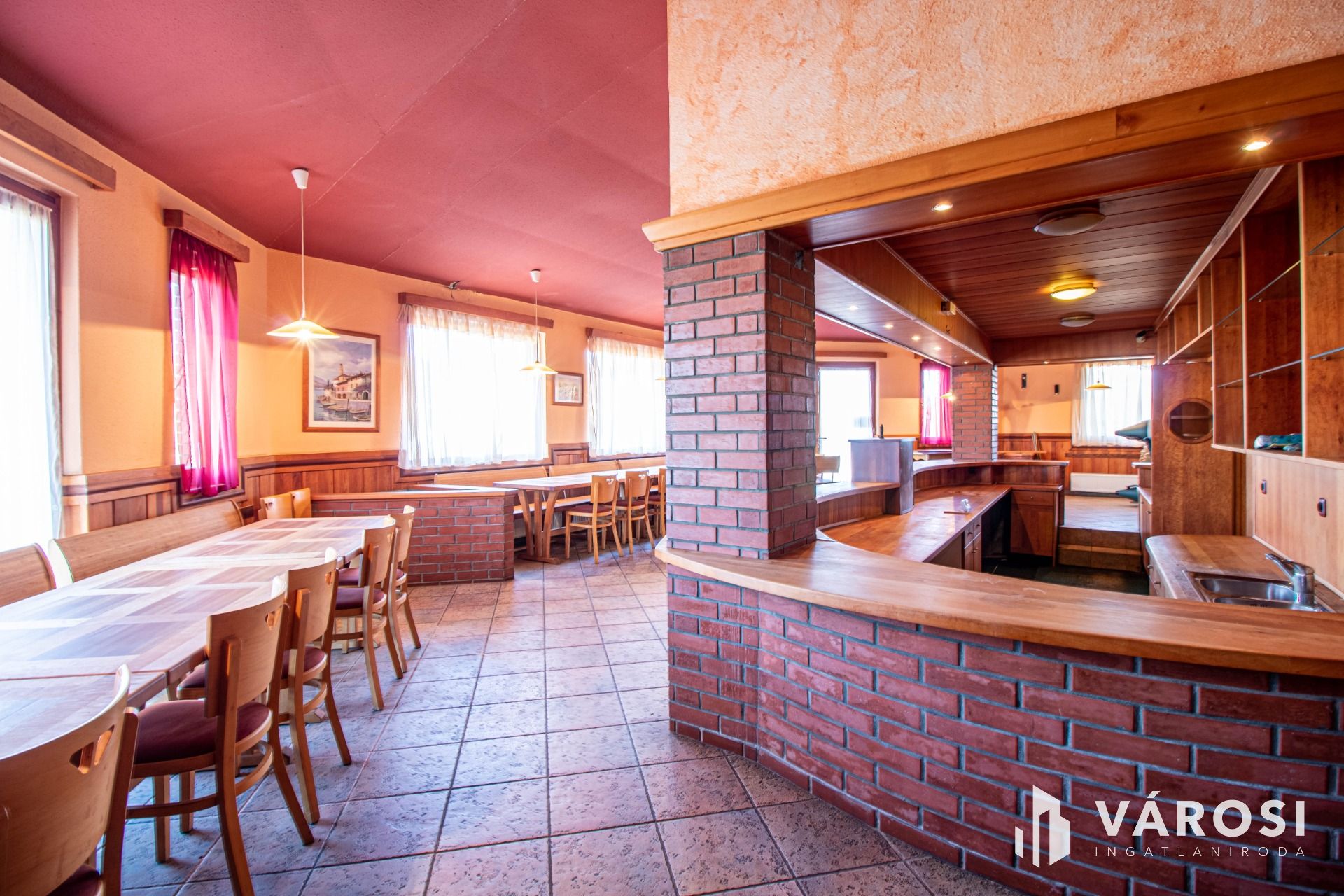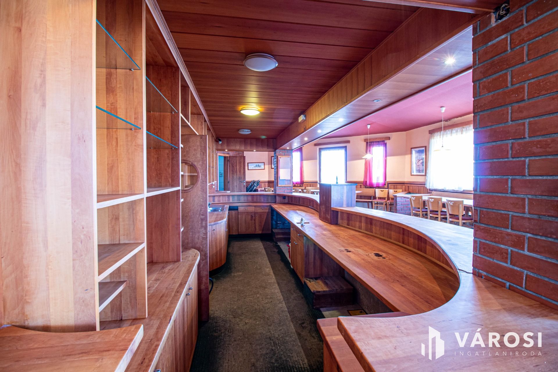 A vendéglátó egység alsó része egy igényesen kialakított étterem, mely közel 50 fő ellátására, befogadására képes. A 170 nm-s nagyságú alsó szinten a vendégtéren kívül az előírásoknak megfelelően ki van alakítva konyha, valamint az ehhez tartozó kiszolgáló helyiségek, raktárak, a vendégek és a személyzet számára pedig a megfelelő vizesblokkok is. A vendégek számára fenntartott tér közepén egy impozáns, vadkörte fából készült kiszolgálópult kapott helyet, mely valóban egyedivé és hangulatossá teszi az épület központi részét. A földszinthez közel 50 nm nagyságú terasz rész is kapcsolódik. Az emeleti részén 2 szoba és egy fürdőszoba került kialakításra. A szobák bútorzata szintén egyedi készítésű, melynek alapja gesztenyefa. Az ingatlan korszerű kamera- és riasztórendszerrel van ellátva. Az épületben minden közmű megtalálható, rendeltetésének megfelelően használható.